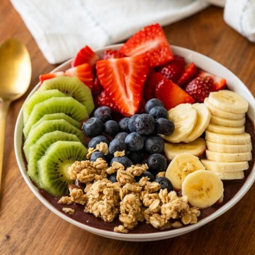 Here’s the basic list of ingredients you’ll need in order to make this healthy Açai bowl recipe. As always, you can find the full list of ingredients located in the printable recipe card below.