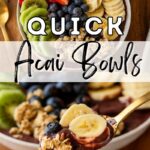 Açai smoothie bowls are filled with açai berries and frozen fruits for a thick and luscious consistency and topped with fresh fruits, granola and sometimes a drizzle of honey or peanut butter.