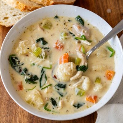 The soup is thick and creamy with little bits of vegetables, chicken and potato dumplings in each bite. Serve with some shredded parmesan cheese on top and garlic breadsticks on the side!