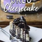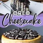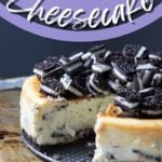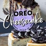 This Oreo Cheesecake boasts a buttery crisp Oreo cookie crust, a thick luscious layer of creamy cheesecake that’s infused with even more chocolate and cream cookie bits, then it’s topped off with what can only be considered a glorious pile of chopped Oreos.