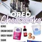 - In the bowl of your stand mixer, fitted with the paddle attachment, beat the cream cheese until smooth. Add the greek yogurt, sugar and vanilla and beat until combined, scraping down the sides of bowl when necessary. Add the eggs one at a time, beating in between. Gently fold in the chopped Oreo cookies, then pour into the spring form pan. Bake for 1 hour, or until the center of the cheesecake is only slightly jiggly.