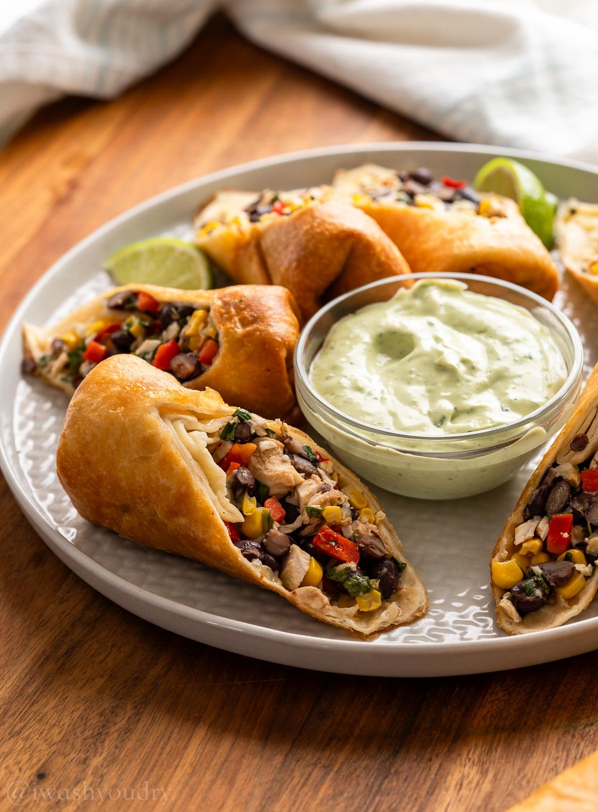 - Combine the ingredients for the avocado ranch dip in a blender and blend until smooth and creamy. If the dip is too thick add a little milk to thin it out to your desired consistency. Serve with the egg rolls.
